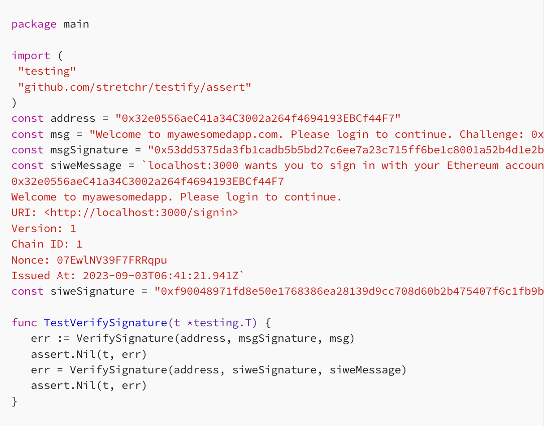 err = VerifySignature(address, siweSignature, siweMessage)assert.Nil(t, err)