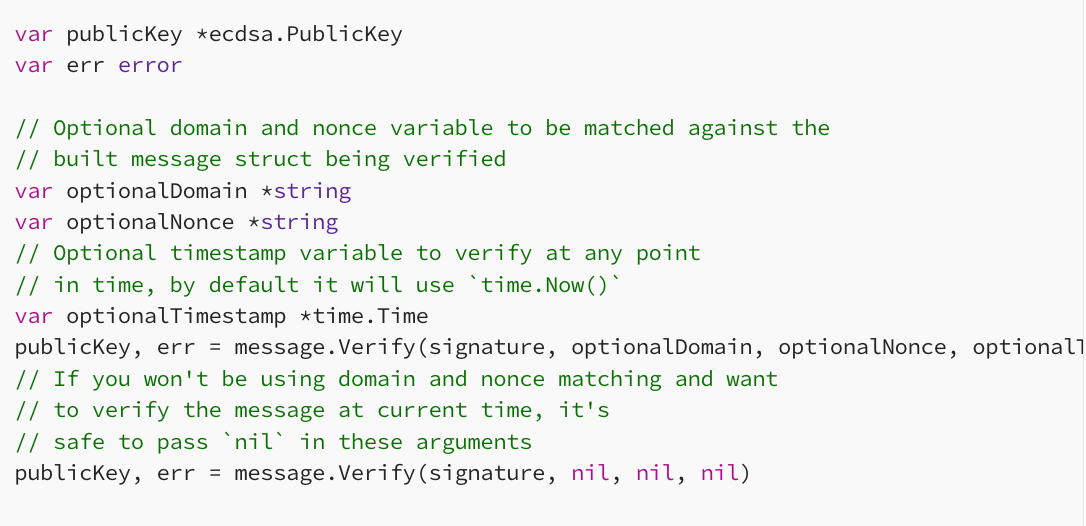 // safe to pass `nil` in these argumentspublicKey, err = message.Verify(signature, nil, nil, nil)