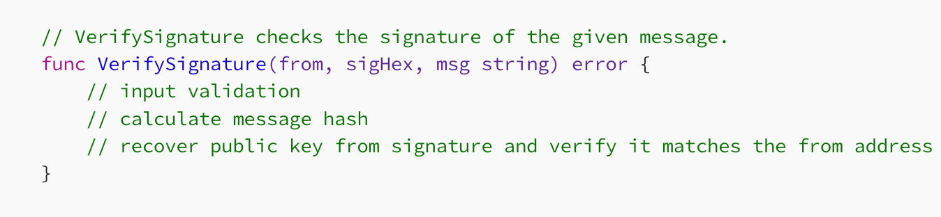 err := VerifySignature(address, msgSignature, msg)assert.Nil(t, err)