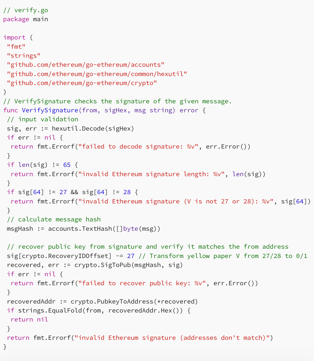 從 TextHash() 的註解可以看到其實這個 hash 的計算方式是會把一個固定的字串(\\x19Ethereum Signed Message:\\n)以及訊息的長度加在這個 message 前面,再用 keccak256 (也就是 SHA-3)做 hash,這個恰好就是 ERC-191 簽名標準的實作方式。另外keccak256 是在以太坊中被廣泛應用的 hash function,在很多地方都可以看到他。SigToPub() 則可以從一個被簽名的 hash 跟簽出的 signature 來計算這個簽名對應的 Public key 身份,而 Public key 就會對應到錢包地址。有了這兩個 function 就能看懂 VerifySignature() 的實作: